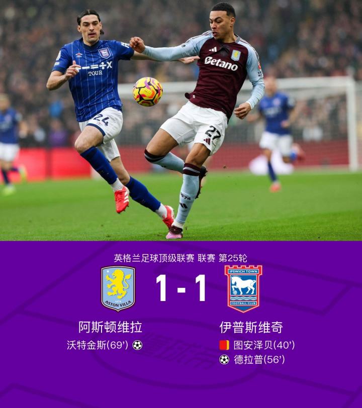 在英格兰足球顶级联赛第25轮的比赛中,阿斯顿维拉主场迎战伊普斯维奇。比赛进行到第40分钟,阿斯顿维拉的图安泽贝吃到第二张黄牌被罚下,使得球队陷入十人作战的困境。这一事件的发生让比赛的局势发生了变化。